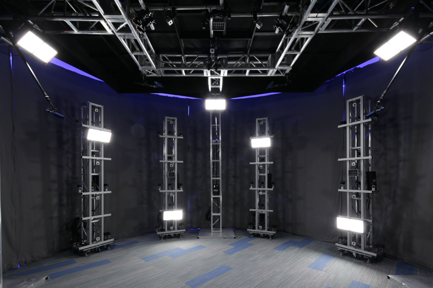 Like other rigs, Dimension is circular, with performers standing in the middle of the area, drenched in bright lights and surrounded by eight microphones and cameras lined along pylons starting at the floor and reaching all the way up to cover the roof. Just outside of the rig is a space the performance is streamed to on a TV (captured on a GoPro hidden inside the setup), and various computers and machinery are nestled away behind a desk on one end of the room. The lighting is purposefully flat, meaning it’s easy for studios to implement their own lighting effects to fit a virtual scene later on, though it can also be adjusted during the performance if you know the exact conditions you want to create.