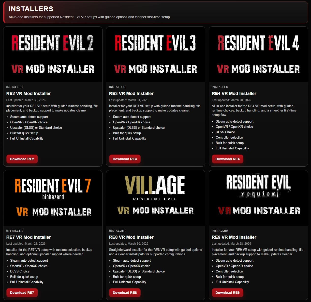 MrSurviv0r's all-in-one VR Mod Installers streamline the process of getting Resident Evil 2, 3, 4, 7, Village, and Requiem playable in full VR on PC.