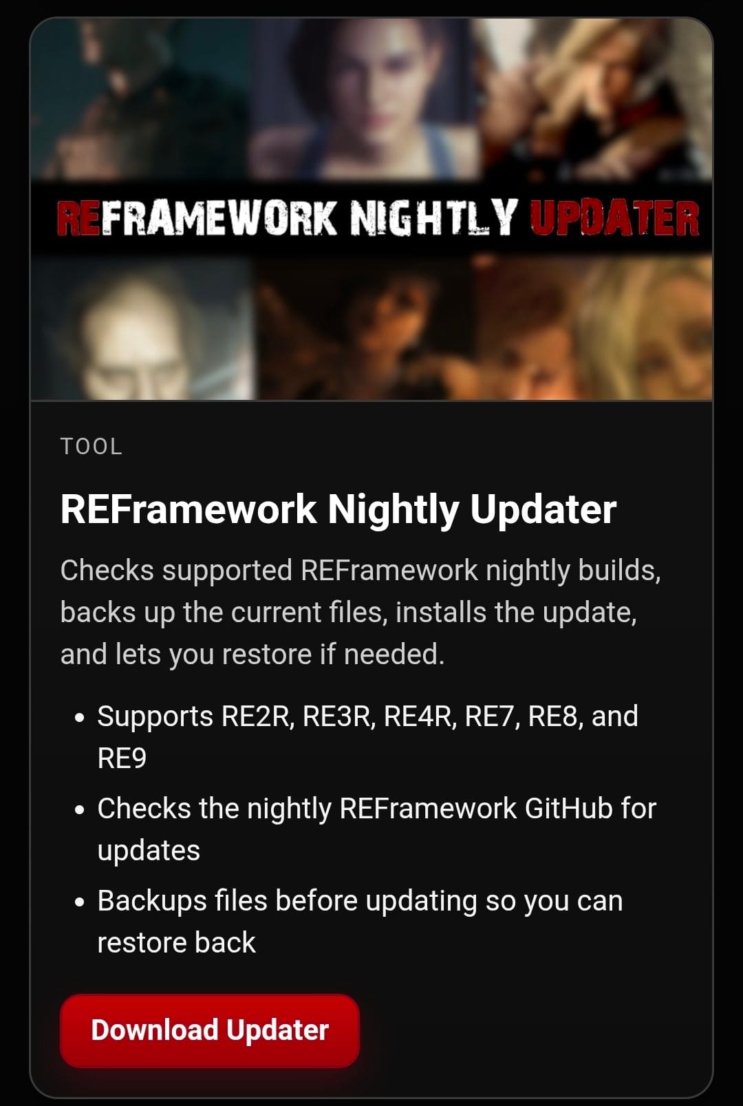 "After that, I started getting requests for a Resident Evil Village installer. That was when it really hit me that Praydog updates REFramework nightly, so I came up with the REFramework Nightly Updater. It detects your Steam installs, lets you check Praydog’s nightly GitHub builds, and gives you the option to update to the latest nightly. Before it updates anything, it scans the files in the nightly zip and backs up those exact files."