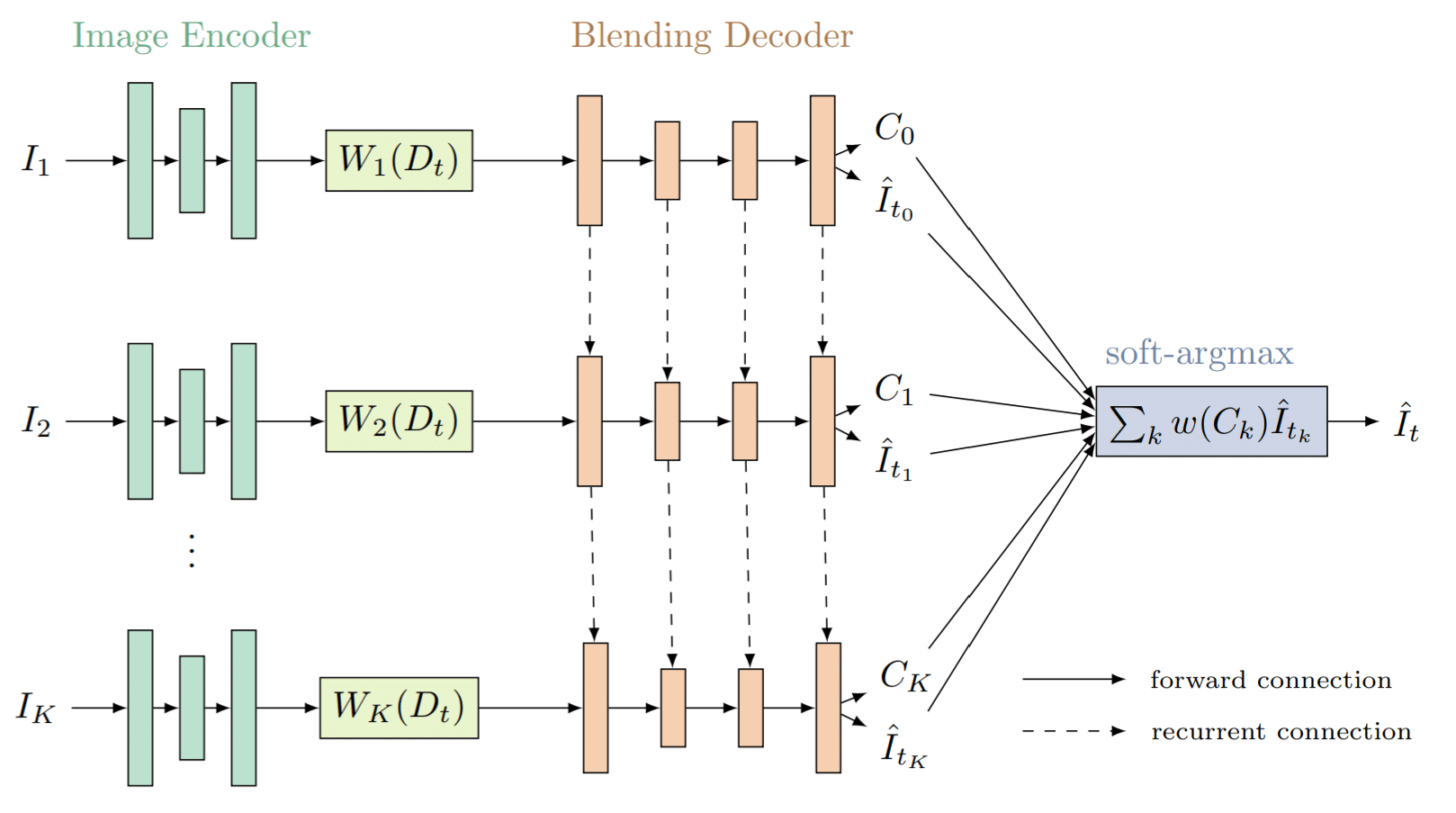 - Step 6: a recurrent neural network (the blending decoder network) aggregates the features into a single blended output frame