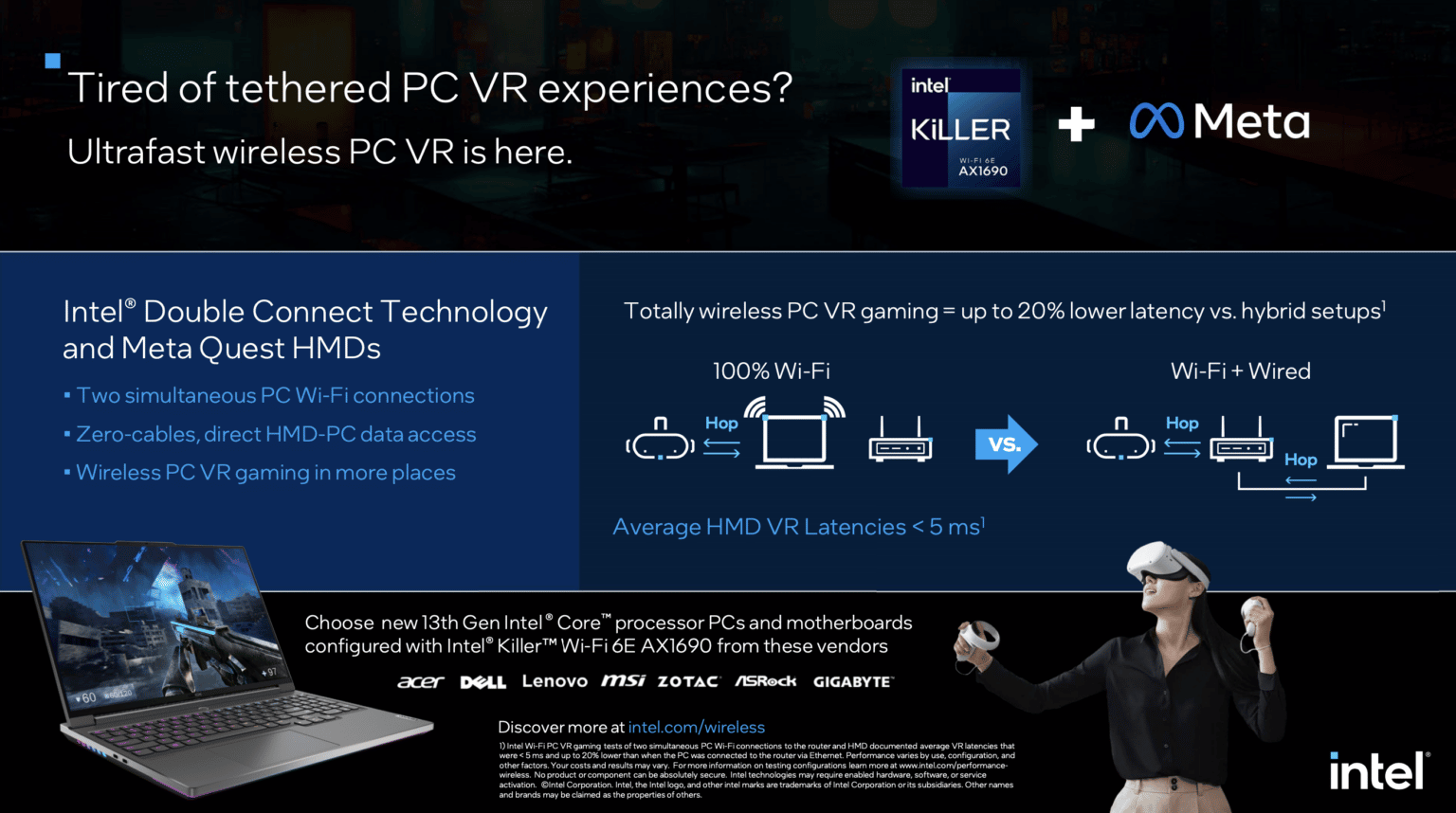 Intel is now offering a new way to connect when using its AX1690 Wi-Fi 6E chip. It has a new feature called Double Connect Technology (DCT), which lets the chip maintain two separate Wi-Fi connections simultaneously, and Intel has partnered with Meta to support DCT with Quest. Your PC or laptop can directly connect to your headset while still maintaining the Internet connection via your router.