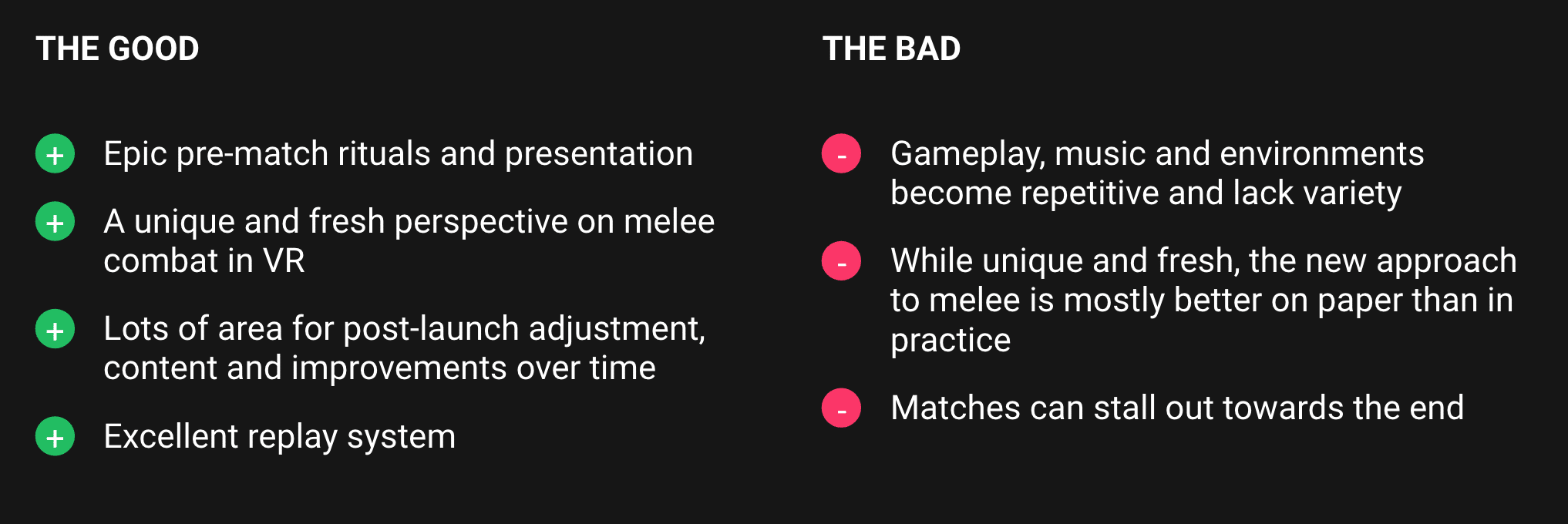 For now though, the game does fall just short of being something great. It’s probably worth checking out if you’re a fan of melee VR games and are looking for a 1v1 multiplayer title, but it’s also hard to gauge the longevity of the game and its mechanics at this point.