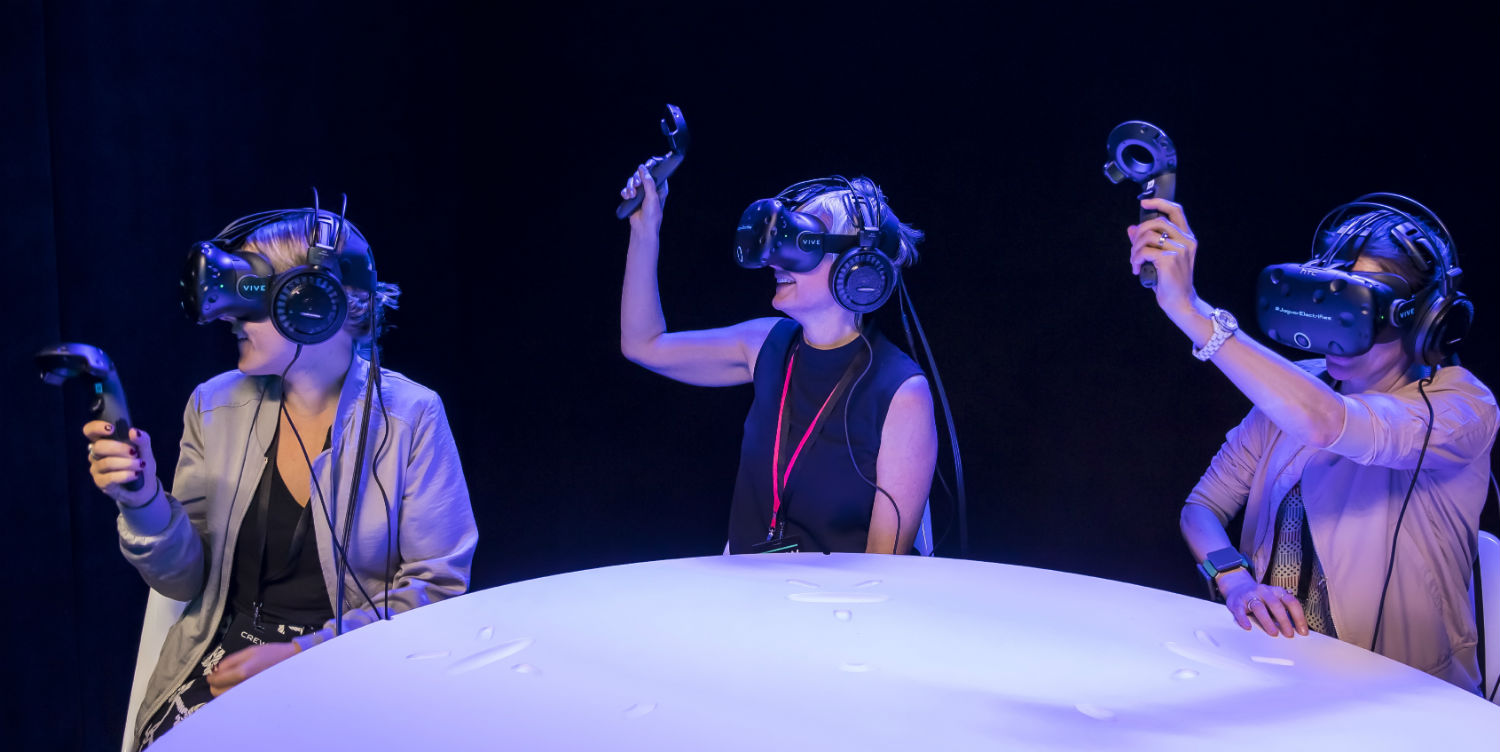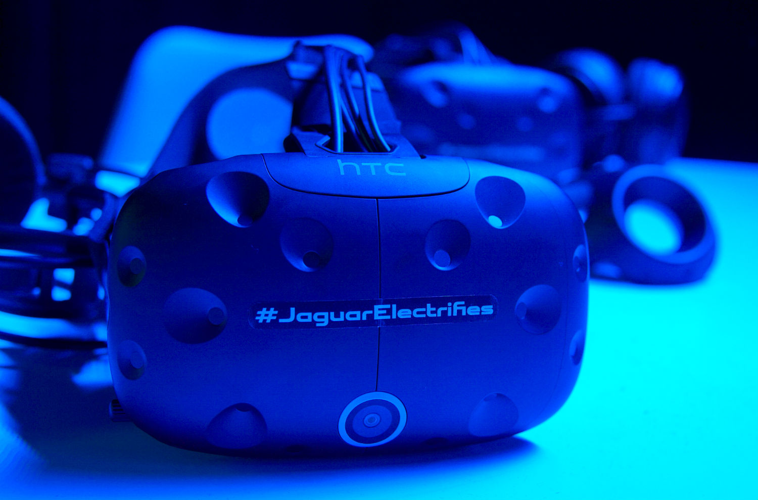Because Jaguar decided to announce the new I-Pace electric SUV completely in VR using presenters, 3D models, diagrams, animations and designs completely in VR. The way Jaguar did it was through HTC Vive headsets placed at every table, with 6 people sitting at a table each with their own HTC Vive headset, headphones and single Vive controller.