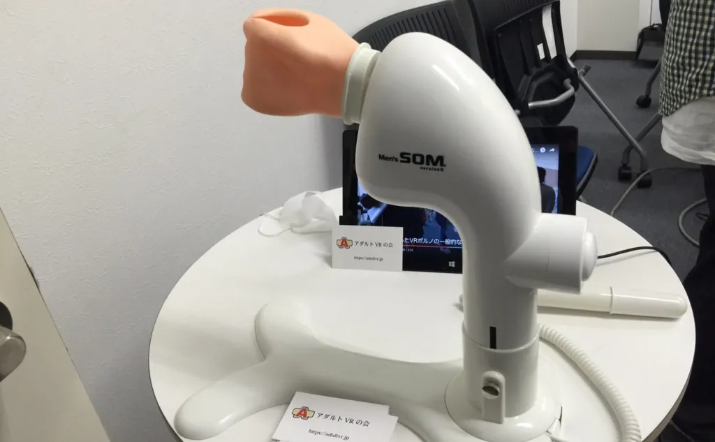 If you were worried about the VR industry becoming fragmented with too many peripherals before, wait until you see what some people are preparing for VR sex experiences. A preview video had already shown us a machine designed to carry out a pretty important part of the love making process with worrying efficiency (pictured by the blogger above), but also on display was a box that users would place their hand into to have air blow on them in a certain way that would simulate touching a breast.