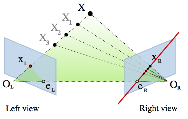 To be totally precise, you’re searching along epipolar lines in the second image. (Because GoPro lenses distort heavily, the lines are actually arcs, unless they’re remapped in memory… but that diagram would totally break my head.) Note that the hyper-efficient algorithms behind this are only a few years old; those interested in geeking out heavily should consider reading “Multiple View Geometry,” which covers both the specific case here and the general case of uncalibrated camera rigs. Available here; full disclosure, I’ve only read the first couple hundred pages, but I probably read each page ten times. It’s dense, and you’ll spend some time trying to visualize things like ‘planes at infinity.’ Plus it’s heavy on linear algebra; enjoy.