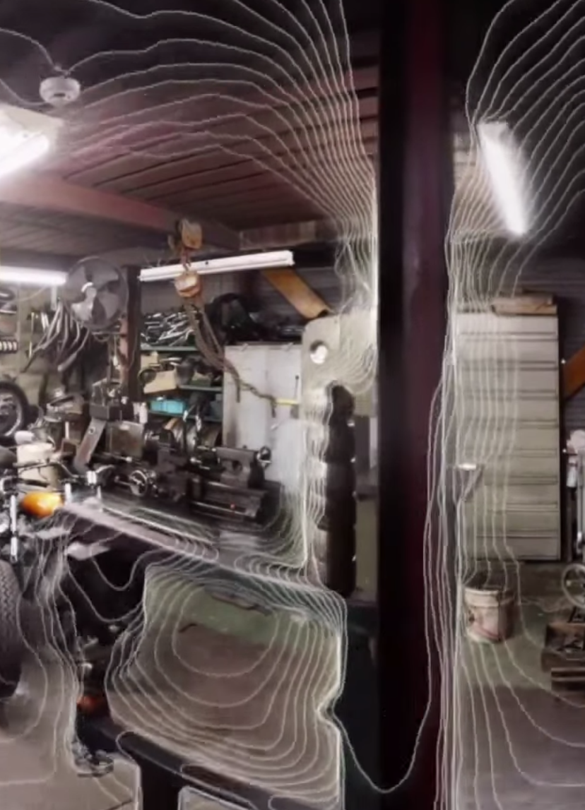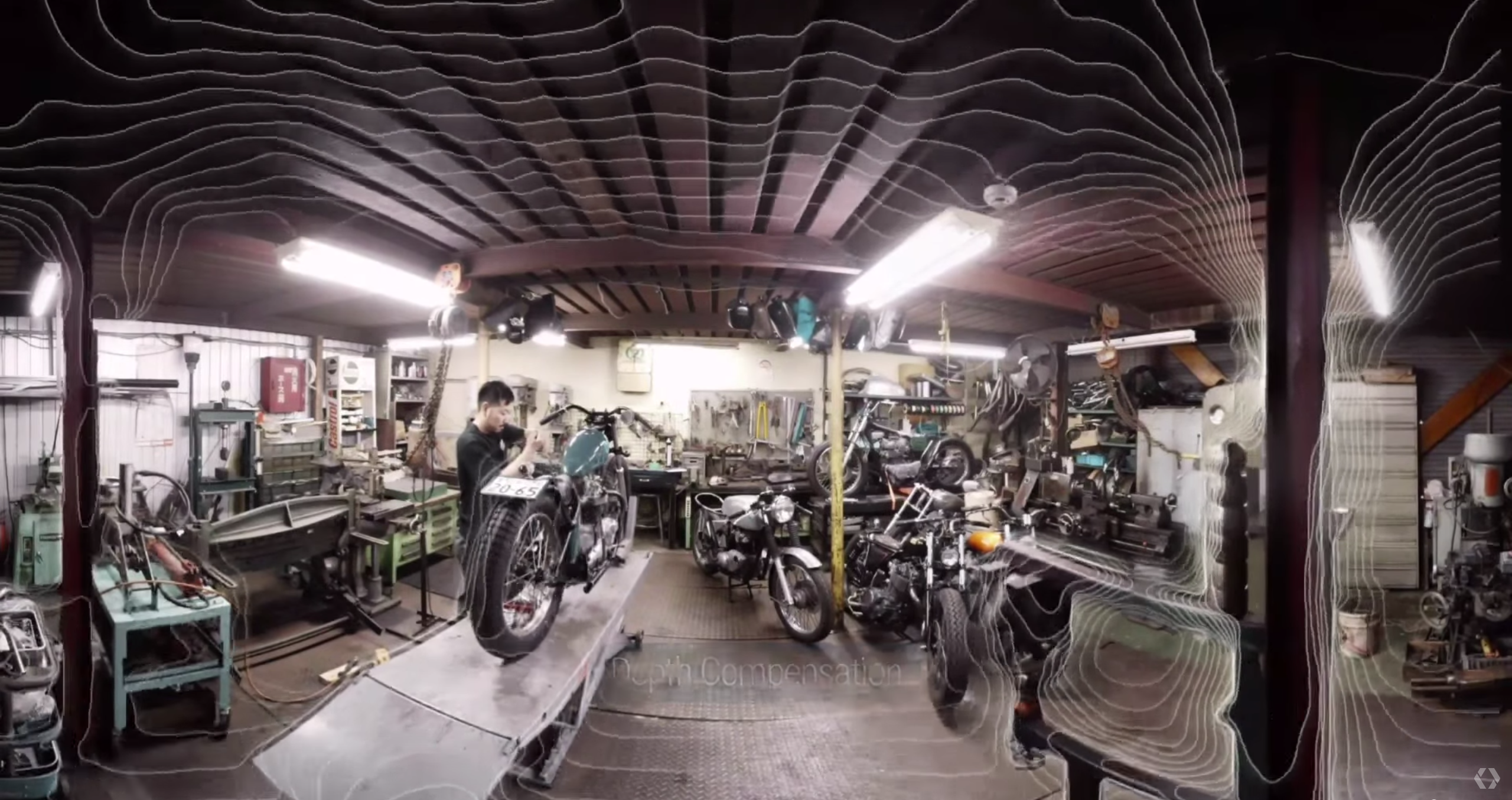 Nonetheless, there will be artifacts. In fact, the demo footage did have some rather visible artifacts if you were looking (and I’m always looking). If you focus on the dies stacked on a press in the center right foreground, their reflections appear to double and shear as you ‘translate’ from side to side during the lateral motion demo. There’s also a curiously doubling motorcycle wheel on the floor behind the press, but that’s a little tougher to see in a screen grab.