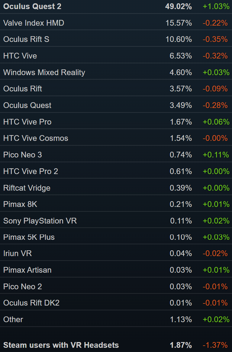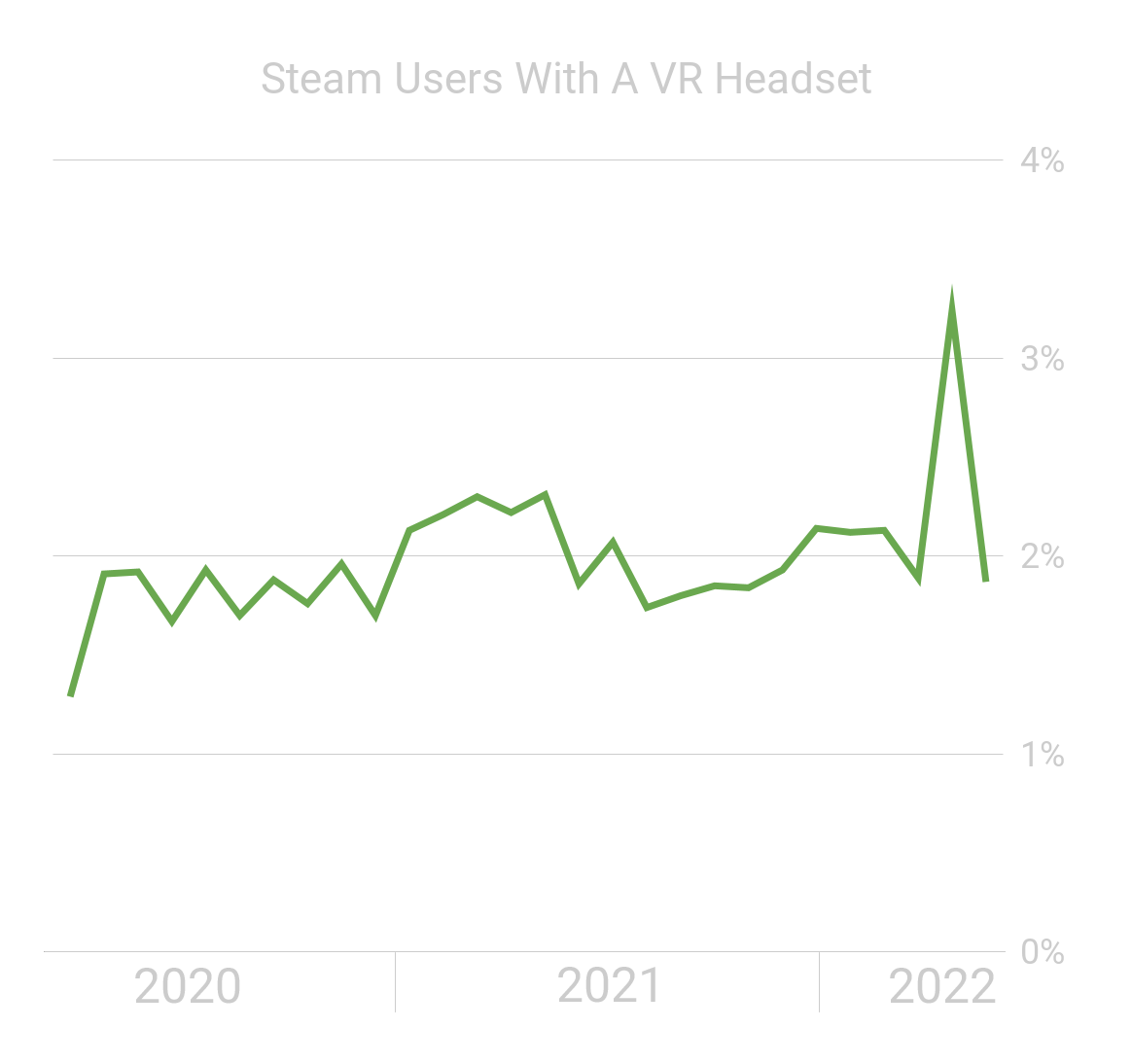 Valve compiles this data to present the overall percentage of Steam users with a VR headset, as well as the relative usage share of each headset model. Since the survey method was changed the previous all time high for VR users on Steam was 2.31% in March 2021. But the data for May 2022 showed a dramatic and unexplained jump to 3.24%. We reached out to Valve for clarification but never received a reply.