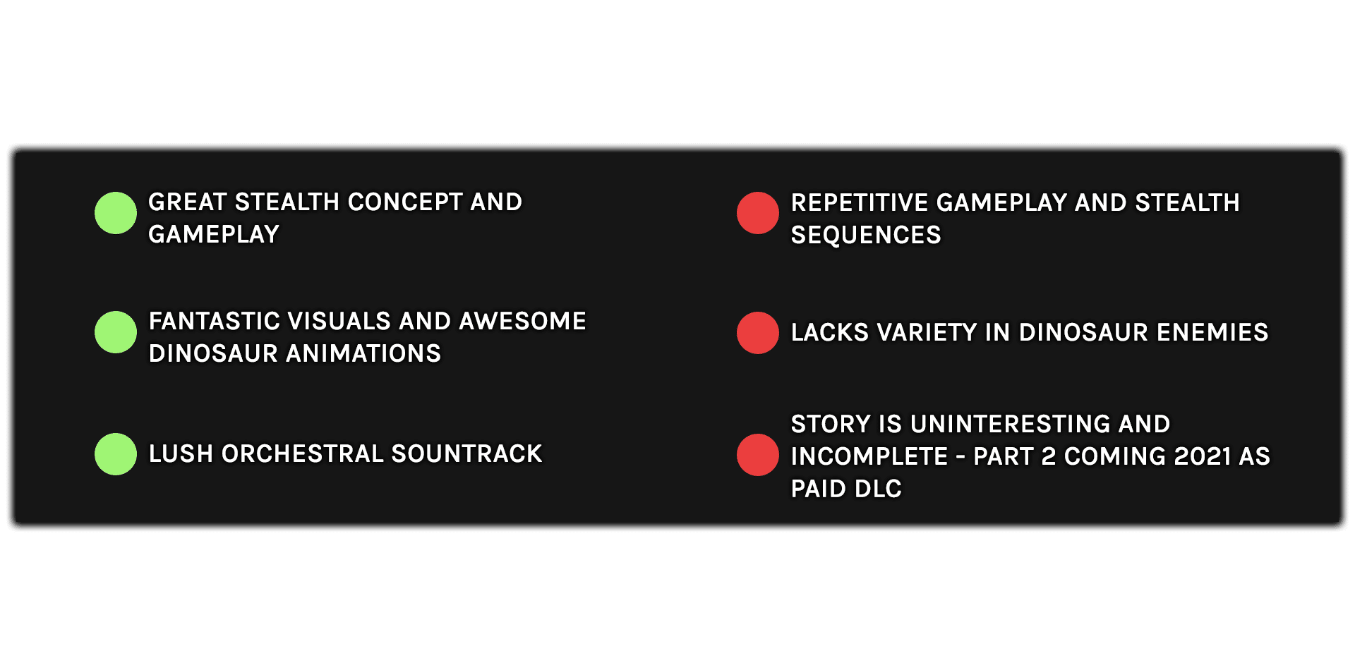For fans of the stealth genre or the Jurassic Park franchise, it’s still definitely worth picking up — don’t get me wrong, the key gameplay loop of avoiding the velociraptors is very fun. However, it feels a bit half-baked. Ultimately, in its half-finished state, Aftermath has some satisfying stealth moments but as a full game it feels pretty vapid and repeats it’s main tricks just a few too many times.