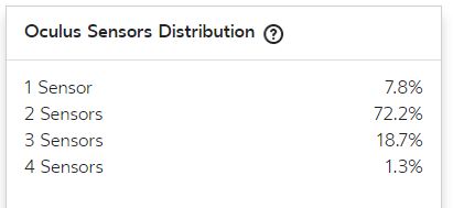 Earlier this year, Oculus added a ‘Hardware Report’ page to their developer website. Recently, they added a new section reporting how many tracking sensors Rift users have connected to their PC. Interestingly, it shows that 80% have 2 or fewer sensors, while just 20% have the 3 or 4 sensors Oculus requires for ‘roomscale’ setup. The percentages below were captured via screenshot and are accurate as of the time of this publication on November 5th, 2018.