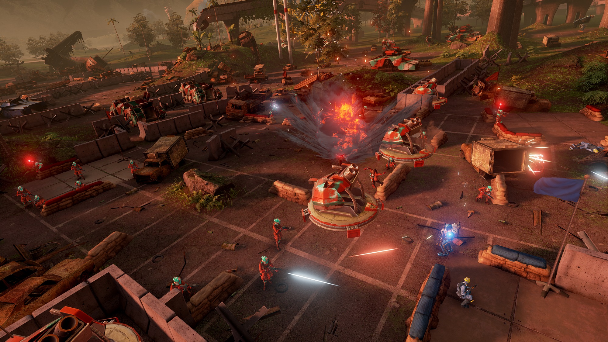 Gameplay in Landfall takes place from a top-down bird’s eye perspective using a gamepad, like you’re peering across a tabletop while playing Warhammer 40,000 or a modern, militaristic version of Dungeons & Dragons. You take direct control of your single hero unit that has significantly more health and does more damage than any of your NPC forces. Moving your trooper is done with the left analog stick, while aiming is done with the right. You fire your primary weapon with the right trigger and use several of your special abilities and equipment with the various face buttons.