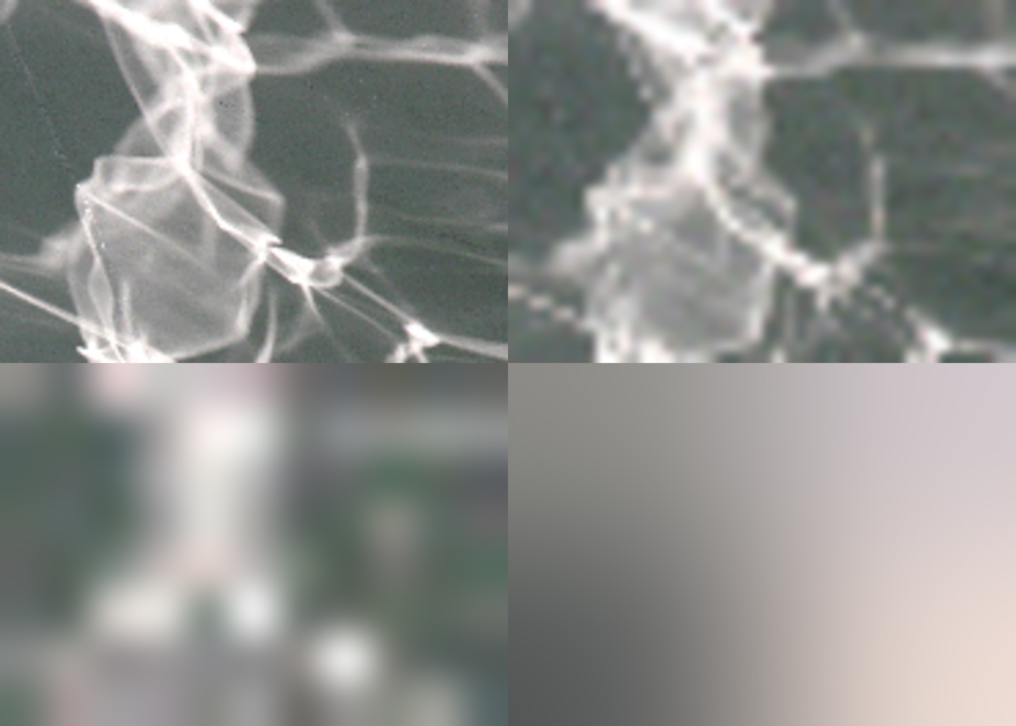 For each resampled image, I downsampled by a linear factor of four from the previous image (for a 16x reduction in total pixels, or ‘cameras’). I also just grabbed every fourth pixel; this simulates the aperture function which throws away most of the light. In the first image, our camera array is now a merely-stupid 25,000 cameras. And the structure looks… basically identical. So far, so good: we’re not losing much by tossing out those extra 375,000 cameras, or 75% of the light.