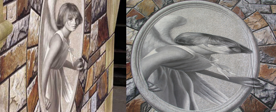 Strangely effective. But… but these trompe l’oeil illusions tend to break when you start to move around; the implied geometry (and shading) is only accurate for a single point of view. As you walk around a perspective painting, the highlights and specularity will stay ‘glued’ to the model, which breaks the illusion. Also, the implied geometry won’t parallax correctly; objects won’t occlude each other or themselves in exactly the right way. Here’s an extreme example:
