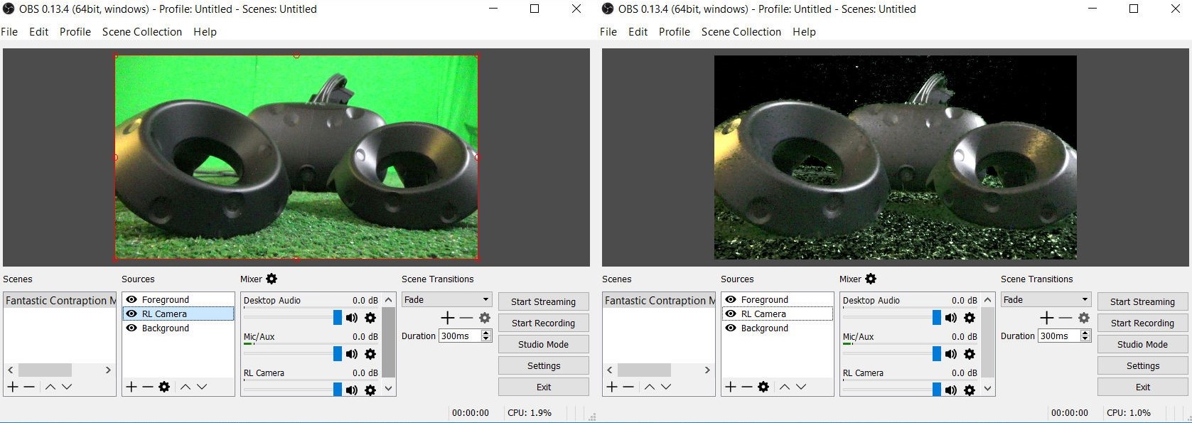 In brief, activating a special setting inside Fantastic Contraption will show four simultaneous camera views into the virtual world. One quadrant shows stuff in front of the headset and another shows stuff behind the headset. The real-life camera you hooked up in step 3 provides a third view. These three layers — VR foreground, real-life camera and VR background — are sandwiched together in real-time by OBS. You’ll set that up in the next step.