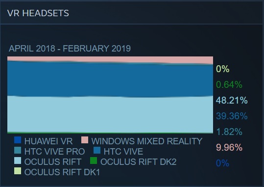 Still, we’re expecting to see some big shifts for the survey pretty soon. Vive is set to launch the Vive Pro Eye in the next few months. It’s an enterprise-level headset so it probably won’t have a huge effect. But HTC’s Vive Cosmos, its next consumer-level device, is also due to release this year. Finally, we’re hoping for the announcement of the Oculus Rift S and Valve’s own SteamVR device at GDC later this month. It’s going to be a busy few weeks.
