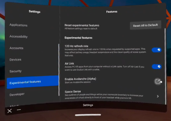 Two days ago redditor /u/technicalthrowaway posted a screenshot appearing to show an ‘Enable Avalanche (Alpha)’ option appearing in the Experimental features tab of their Quest 2’s settings, writing the following: