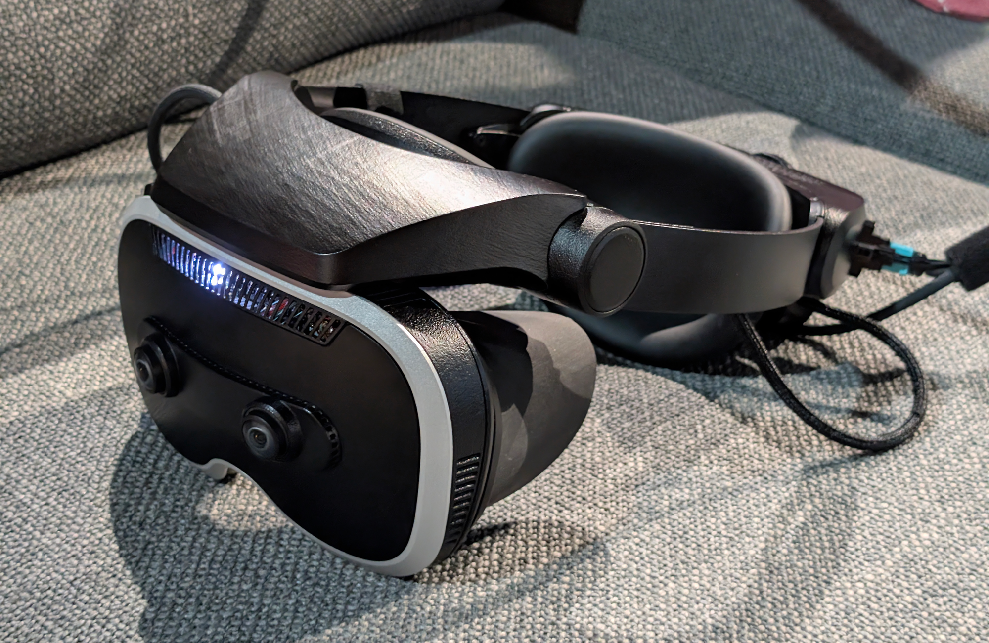 The variant of Boba 3 with cameras on the front supports passthrough mixed reality across the full ultra-wide field of view too - not just for VR. It's technically impressive, as Meta had to develop a custom FPGA pipeline chip with a fiber optic PCI-E interface to carry the dual 20 megapixel cameras at high framerate (USB is simply not sufficient). However, Boba 3's passthrough is not depth-correct, and I saw geometric distortion as I moved my head. Further, I already have open periphery headsets and accessories at home, so I can already see the real world in my periphery. Sure, that doesn't include virtual objects. But nonetheless, all this made Boba 3's mixed reality experience slightly less impressive than its VR.