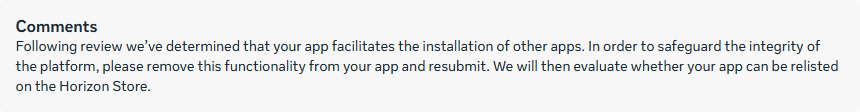 Meta's removal comment to the developer says that it "determined that your app facilitates the installation of other apps", so to "safeguard the integrity of the platform", he would need to remove the APK installation capability and resubmit the app.