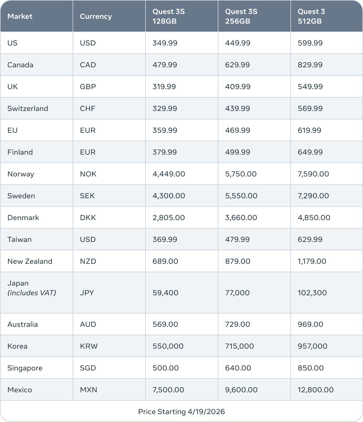 - Quest 3S (256GB): $400 → $450