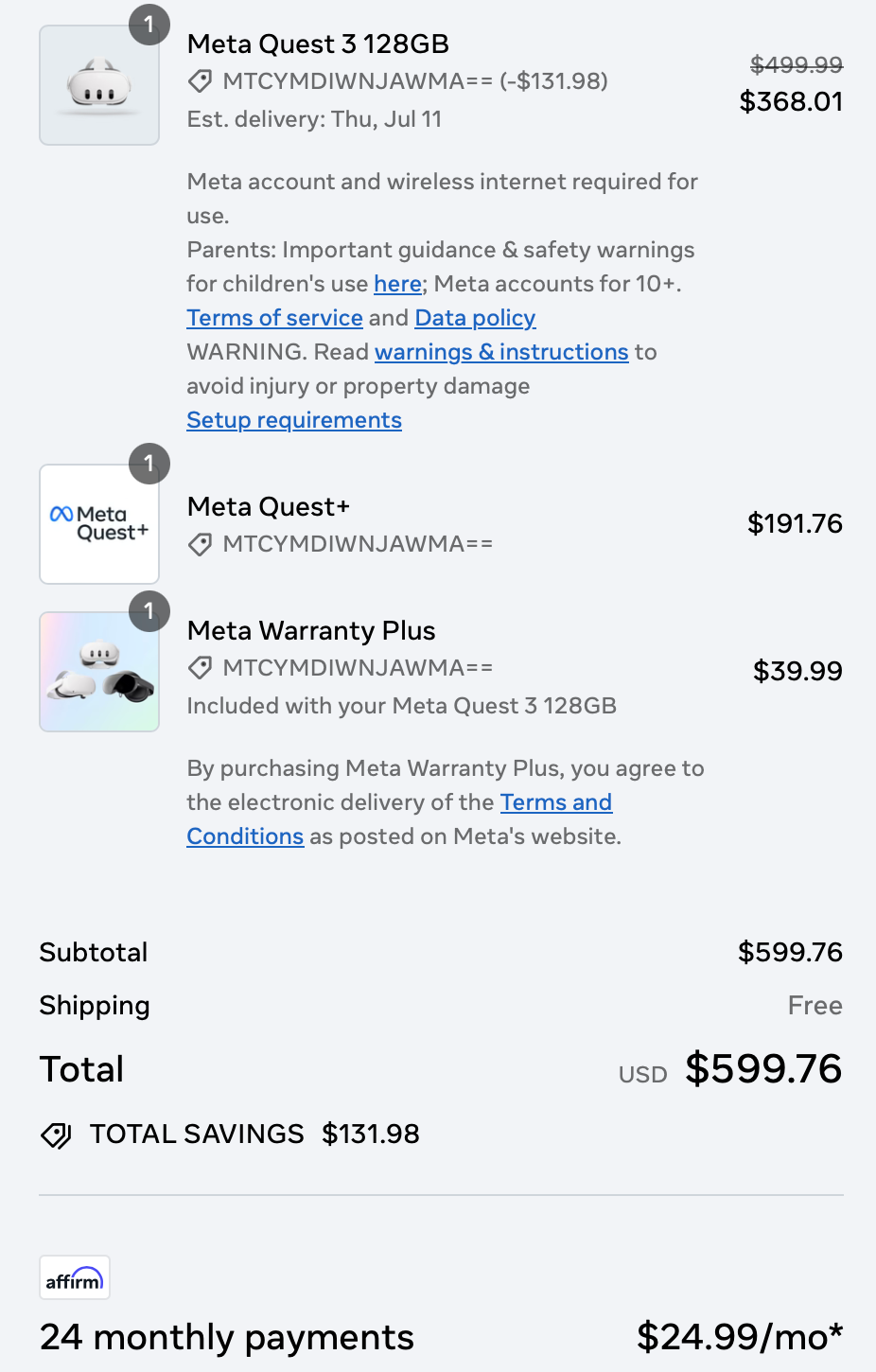 The math on the "buy now, pay later" page discounts the Quest 3 to bundle in the two year Quest+ gaming subscription as well as the company's "Warranty Plus" service, which requires a fee to repair "mishandling during normal usage, such as accidental drops or liquid spills or submersions".