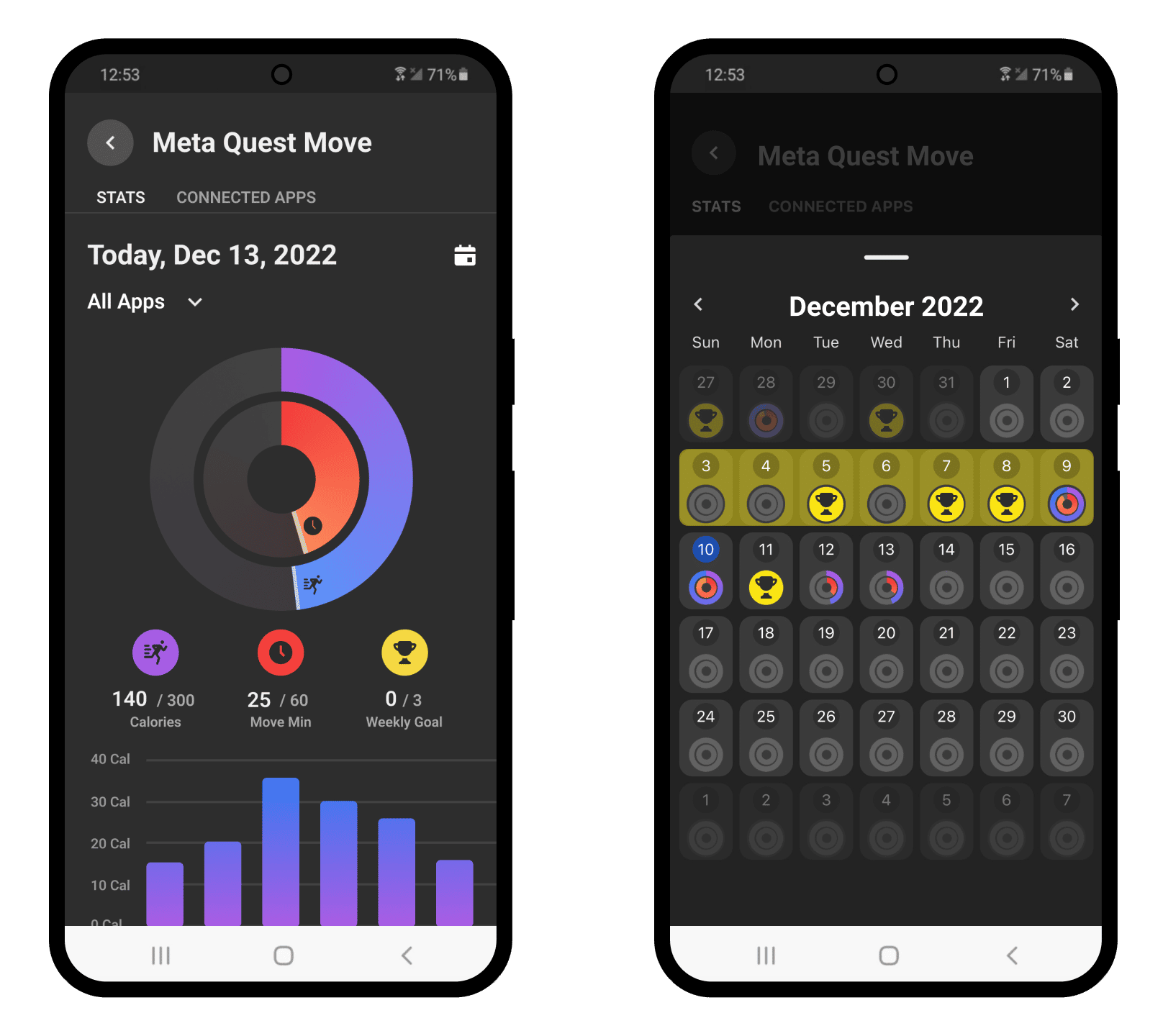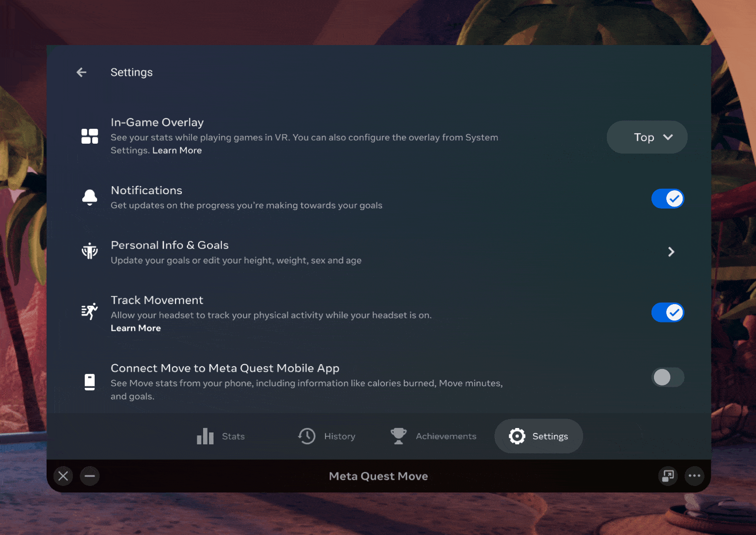 Formerly known as Oculus Move, the feature of Quest headsets monitors your physical activity to track the calories you burn in VR, your move minutes, and your workout intensity. It’s mainly intended for fitness apps like Supernatural, but it works in all apps, and gives you a per-app breakdown of the stats.