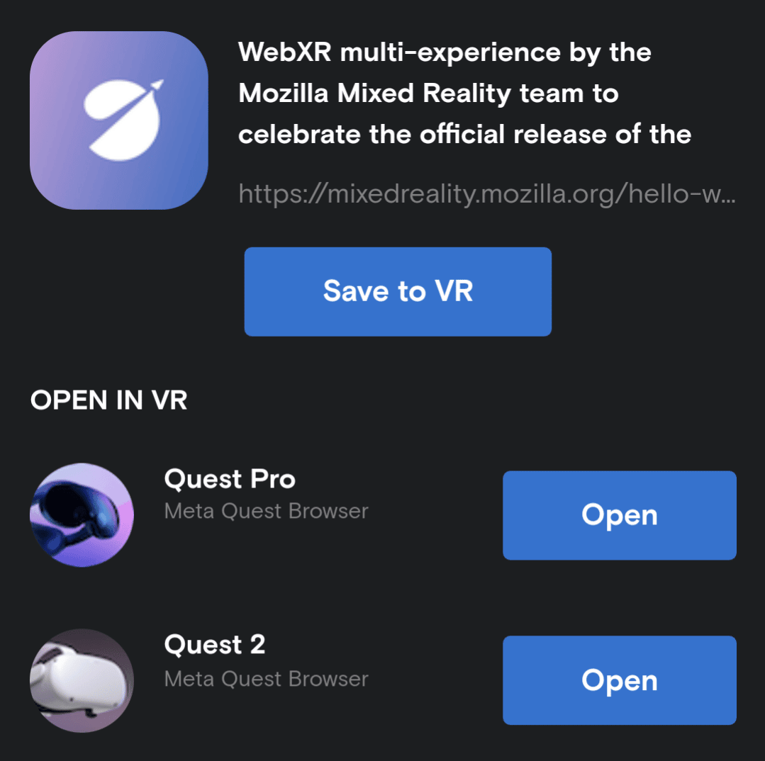 Clicking the link will navigate to an ‘Open in VR’ interface on Oculus.com asking which headset you want to launch on. The chosen URL can be a regular website or an immersive WebXR experience.