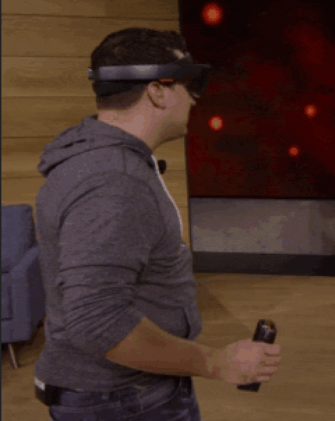 Seen in this gif, the device appears to be some sort of cylindrical input about two inches in diameter that is held in the hand. There appears to be a small red button or light on the top. During the majority of the presentation the device was hidden by a holographic mesh that seemed to be locked to the demonstrator’s arm, however it very well could have been tied to the device itself – a somewhat less impressive achievement if that is the case.