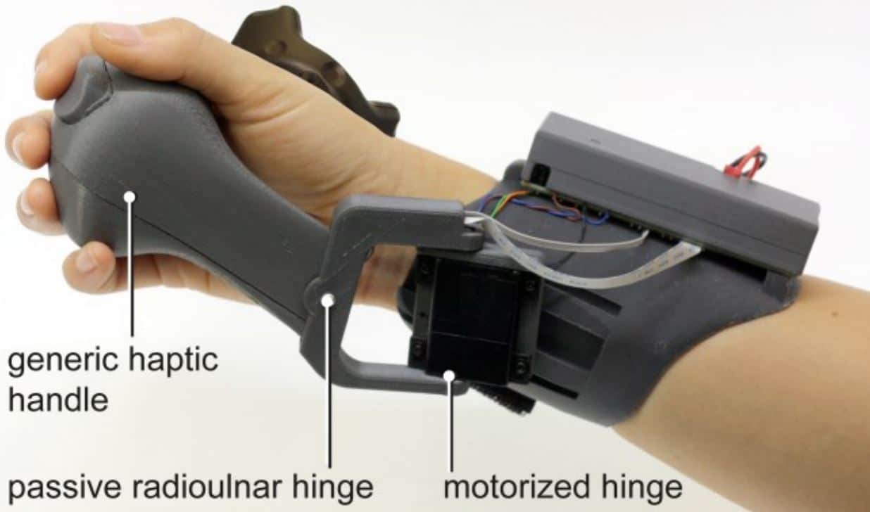 We’ve seen other research with objects that stretch or transform in shape — could that be applied here to offer different types of in-hand objects which swing into position at just the right time? The paper details other “exploratory” prototypes they’d considered, including a design that featured a retrofitted Windows Mixed Reality controller’s handle that could swing into your grip, and another design with a 3DoF joystick.
