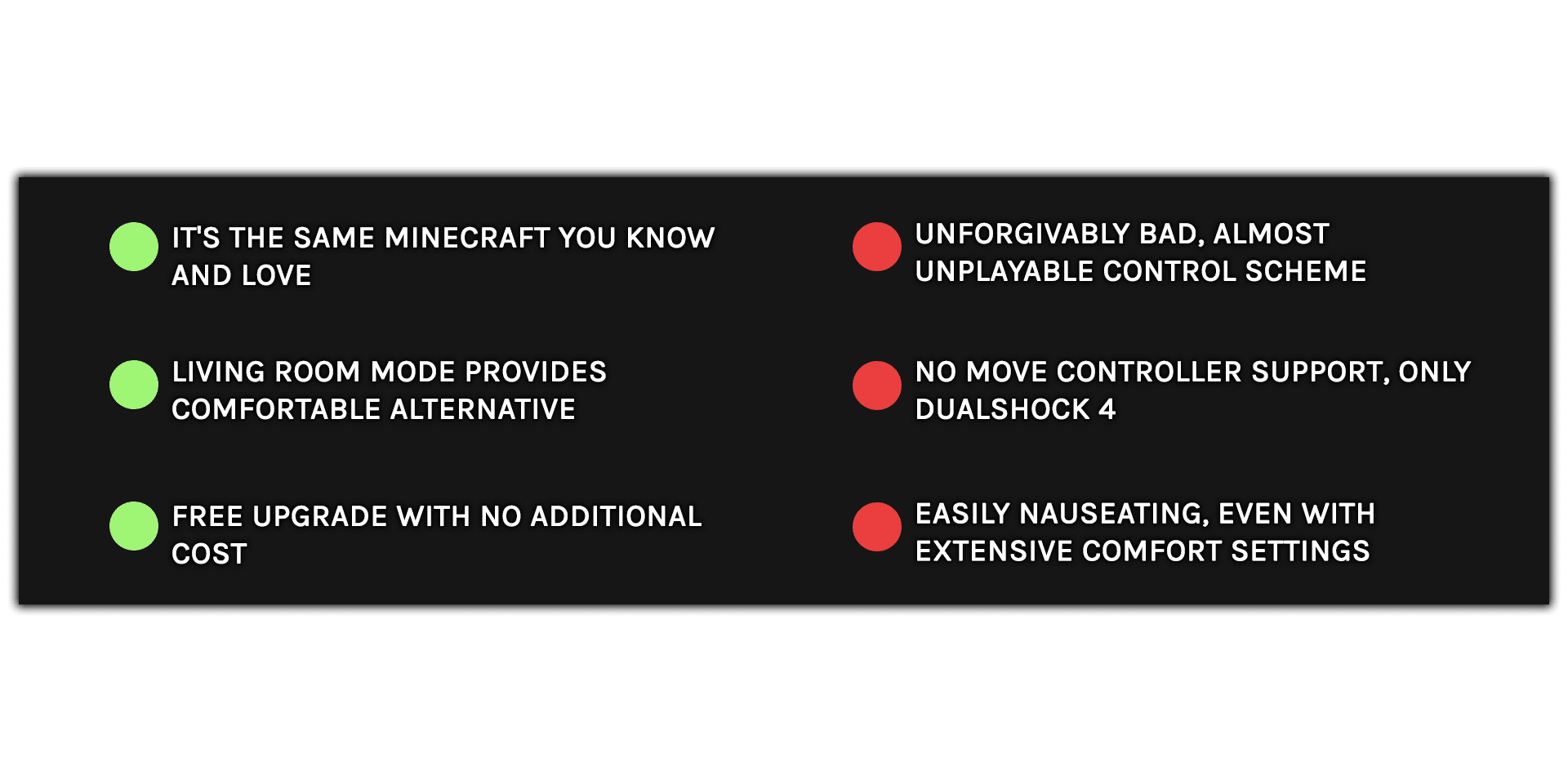 It’s a shame I’ve spent so much time in this review talking about what Minecraft PSVR does wrong — that’s certainly not what I wanted to focus on. However, there’s no getting around how unforgivable the current PSVR control scheme is — it makes the game borderline unplayable, nauseating and physically strenuous on your neck. It’s a shame because Minecraft is an amazing game and there’s huge potential for a great VR version on PlayStation 4. As a fan of the franchise, it’s disappointing that the three-year-old Rift release does a better job.
