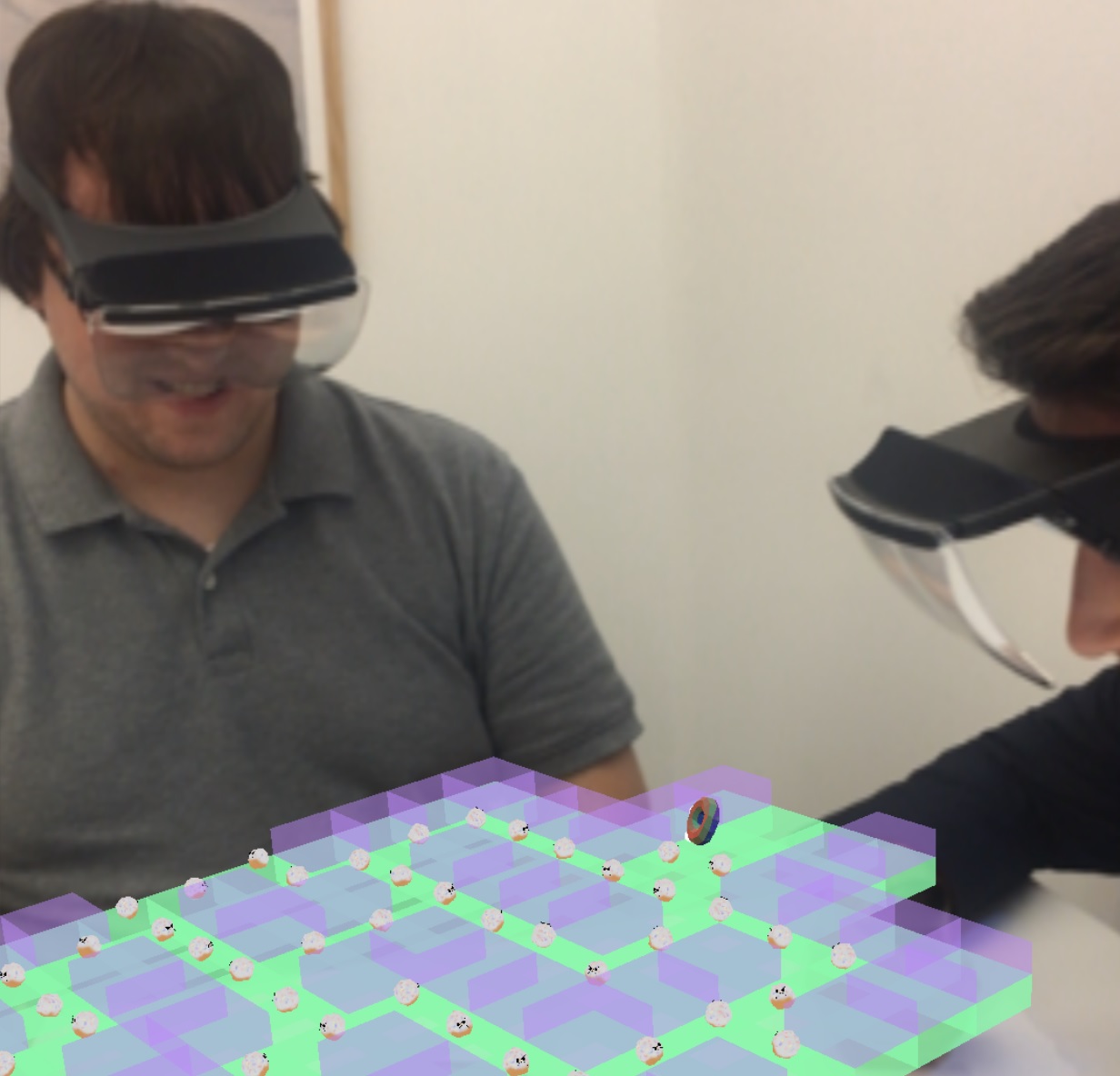 The two main demos I tried involved spinning around in circles while shooting aliens, similar to Face Raiders on the Nintendo 3DS, and guiding a rolling doughnut through a maze reminiscent of Pac-Man. For the latter demo Stern actually put on a second Prism headset and joined in through wireless networking. We were able to both look down and see the same maze on the table using the AR card marker, shown above. The image you see was taken using Mira’s “Spectator Mode” which allows anyone with an iOS device or iPad to watch the experience happening in real-time.