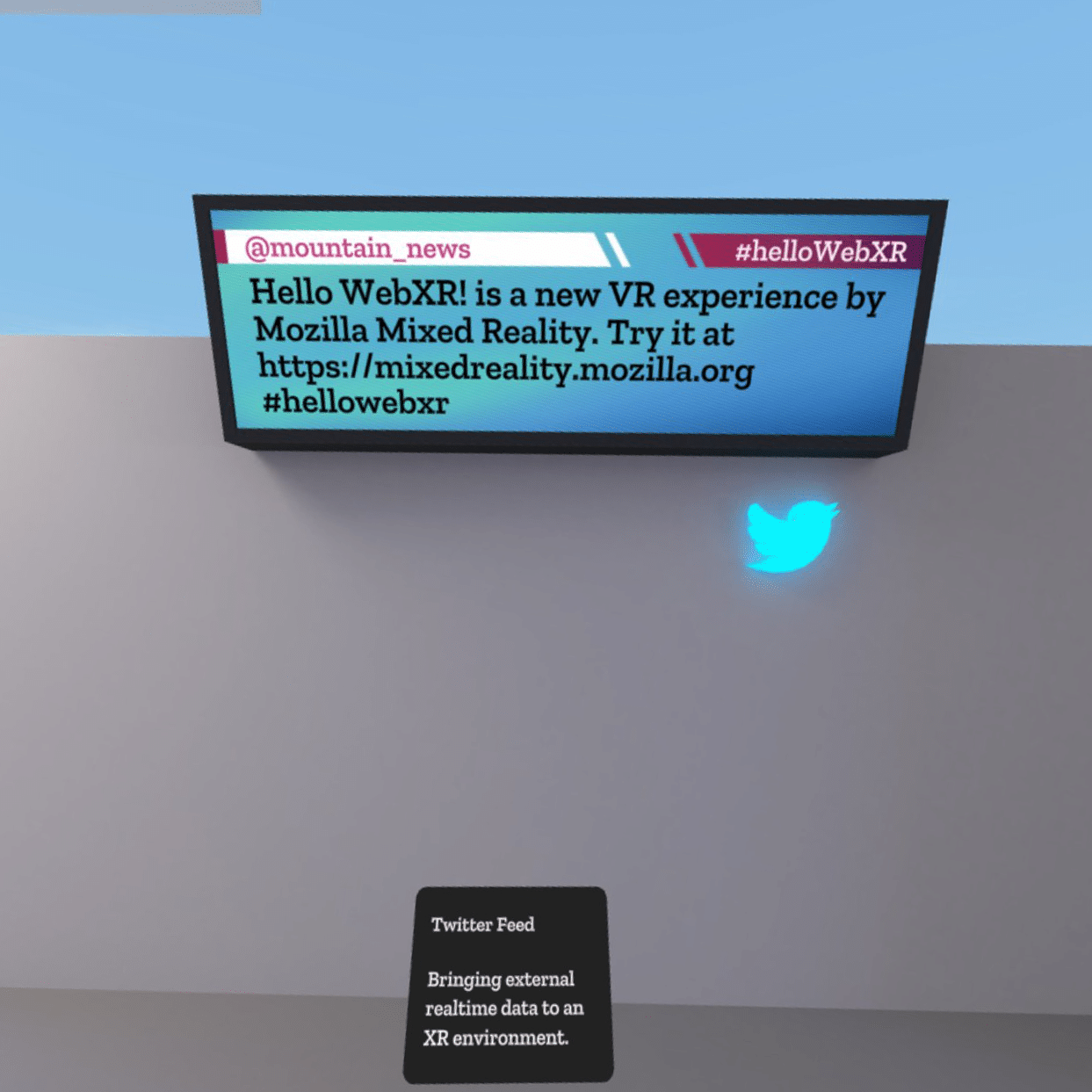 But what about bringing the regular web into the VR web? Mozilla demonstrates this with a “Twitter Feed” screen, which shows Tweets that use the #helloWebXR hashtag. This is where WebXR shines, developers can more easily integrate the wealth of APIs and frameworks that already exist for the web ecosystem.