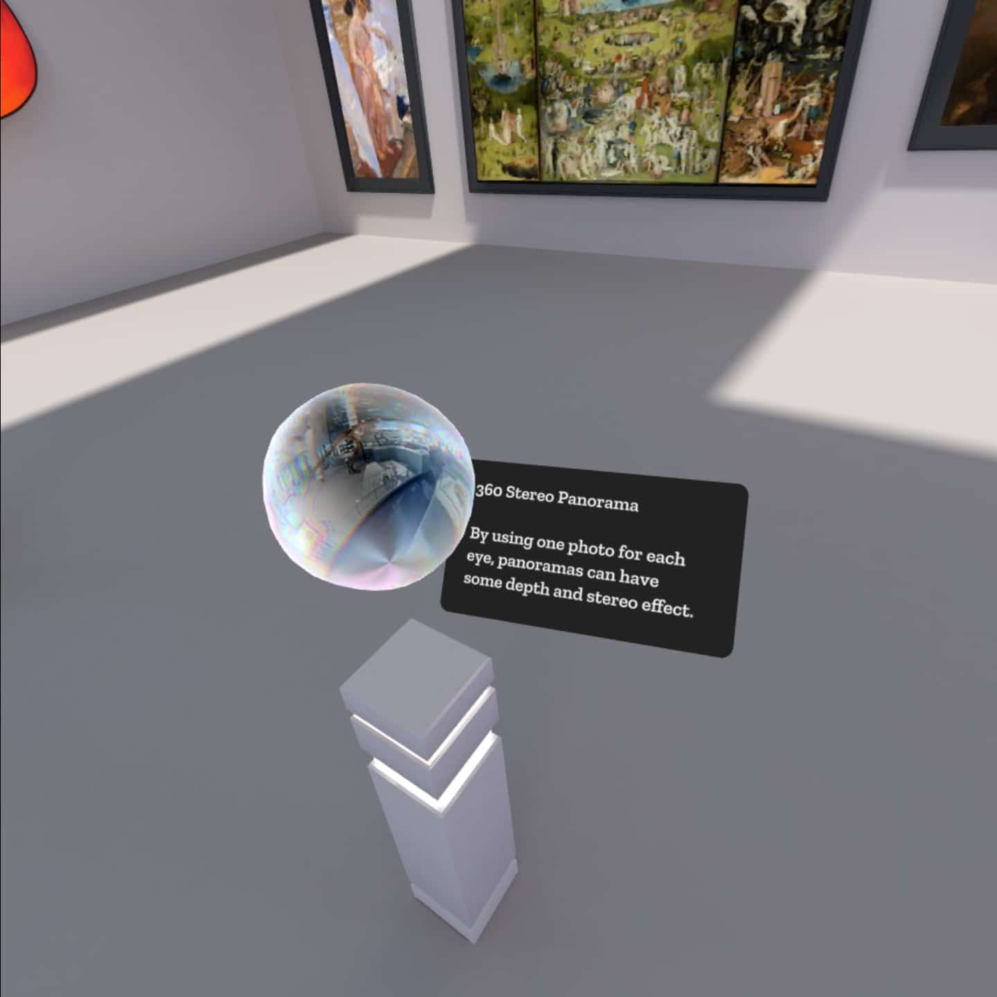 Also in the center of this hall are spheres which, when selected, immerse you in a 360 degree photo, similar to the user experience of Valve’s The Lab. Each loads instantly, demonstrating how WebXR can be easily used to distribute this kind of content.