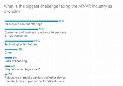The majority of respondents did not claim that the high prices of hardware or the still niche-nature of the VR market as being their chief concern for the consumer adoption of VR. Instead, according to the survey, the majority of those polled, “Cited the lack of compelling content, problems with user experience and cost as the main impediments to AR and VR adoption in the coming years.”