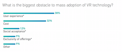 To be more specific, 38 percent of respondents cited “user experience” as the biggest obstacle facing VR adoption today, while only 32 percent cited cost. Similarly, 37 percent of those polled chose inadequate content offerings as the biggest challenge facing the VR industry and only 23 percent picking consumer reluctance and 20 percent choosing technical limitations.