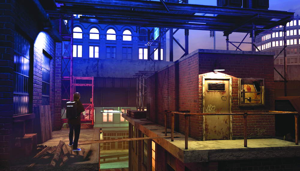 I was instructed to pull a gun out of a desk drawer and got my hands on a weighty pistol. I then stepped out onto the building’s fire escape and was greeted with ambient noises and a fresh breeze that instantly convinced my brain it was both outside and up high. I walked across the catwalk and was met by a band of enemy drones that I had to shoot down with my weapon. From there the experience had me walking across narrow planks and riding up outdoor elevators before finally reaching an EMP and terminating all my robotic foes.