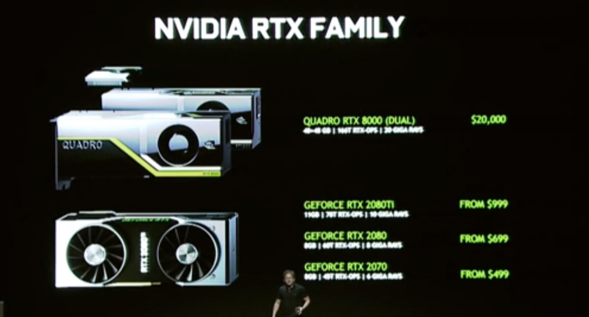 The new RTX 2080 card should start shipping around September 20 and costs $800 from NVIDIA’s website. A higher end RTX 2080 TI will start shipping that same day for around $1,200. There’s also the 2070 at $600 but there’s no shipping window for that card yet. Different starting prices were shown on stage by NVIDIA at a Gamescom press conference that should give you some expectations for prices you might see once these cards are available from multiple companies.