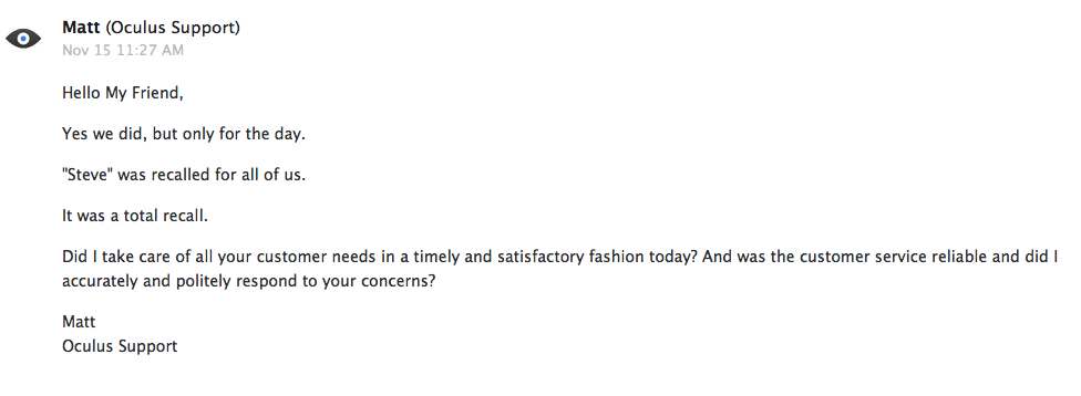 “Oculus Customer Service, This is Steve.” The folks over at Oculus have a great sense of humor. In response to Wednesday’s South Park episode, all of the customer support tickets on Thursday were answered by “Steve” who wanted to make sure he “[took] care of all your customer needs in a timely and satisfactory manner.” This excellent little Easter egg appeared to have gone relatively unnoticed, but after sending a quick message to the real Oculus support team I received a terrific response from ‘Matt’ confirming the joke: