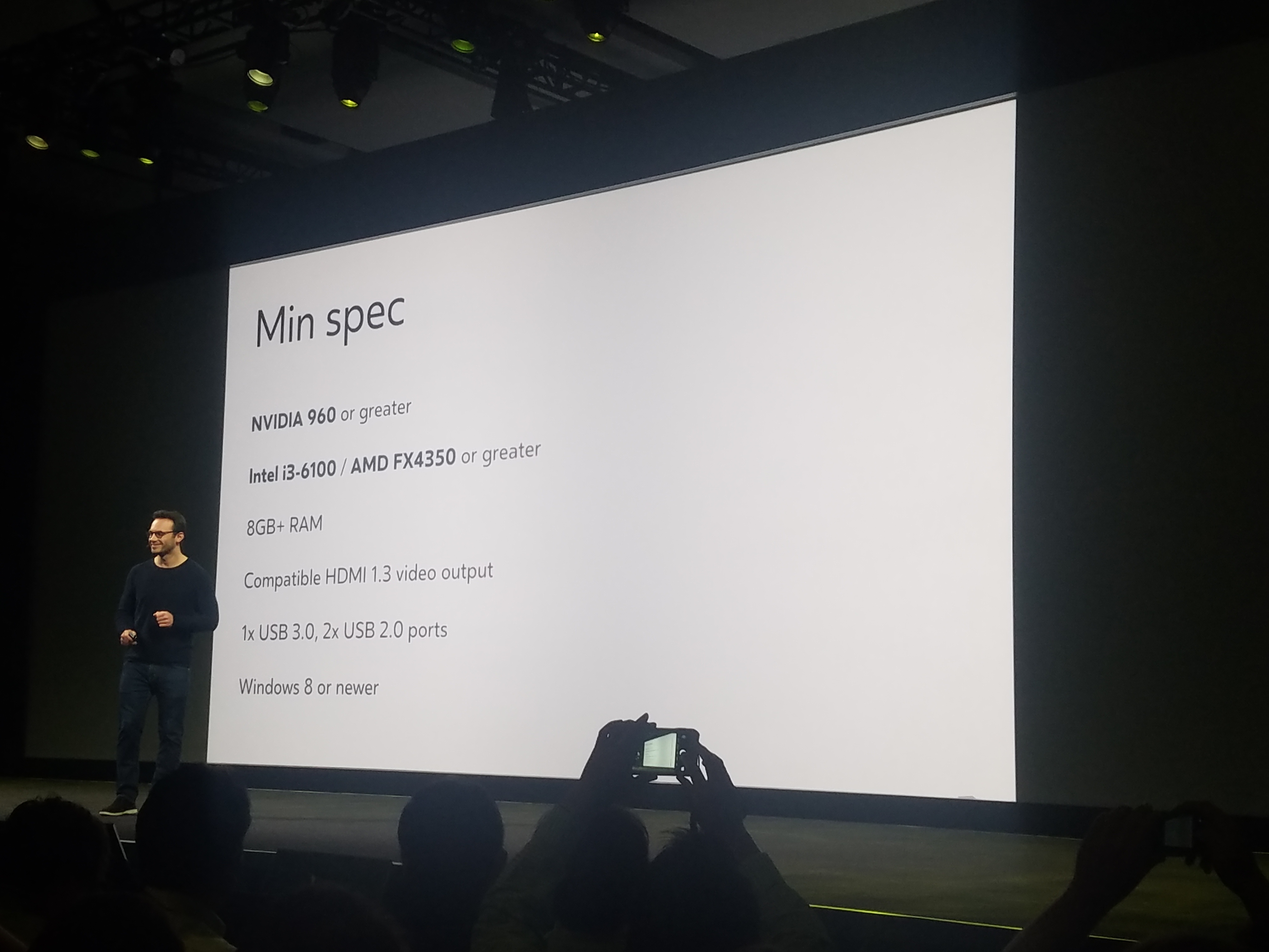 During the 2016 Oculus Connect keynote speech, company CEO Brendan Iribe pulled back the curtain on a minimum spec for VR capable machines. The list includes an Nvidia 960 graphics card, Intel i3-6100/AMD FX4350 processor, 8GB+ RAM, and the usual HDMI and USB requirements along with Windows 8 OS. True, that’s lower than the previously provided set of specs, which included an Nvidia 970 or AMD 290 card and Intel i5-4590 processor, but those are the recommended specs, not minimum.