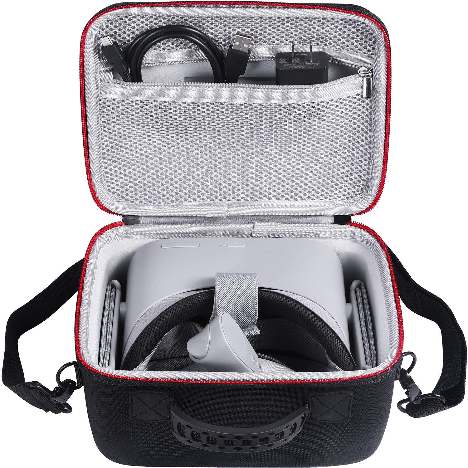 There are a number of carrying cases you can get for Oculus Go ranging from unofficial ones priced around $20 to the official case, pictured below, priced at $35.