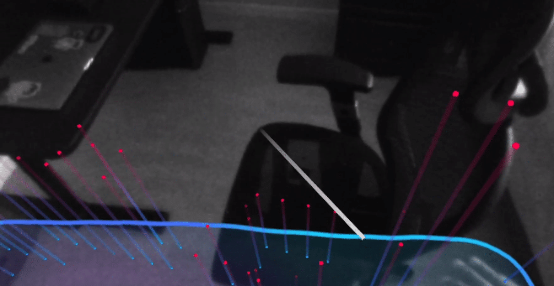 When you walk near the boundary in VR it becomes visible, marking out the safe area to play VR. If you walk through it, you’ll see the real world again (in black & white).