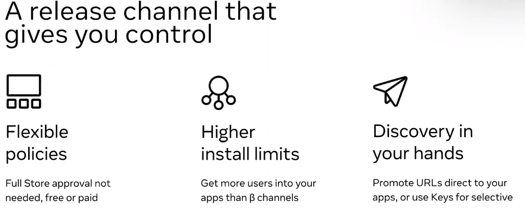 At Facebook Connect, Product Manager Raisah Aziz shared the first details. This new release channel will “not require store approval”. Developers will be able to share them via a URL, or via keys.