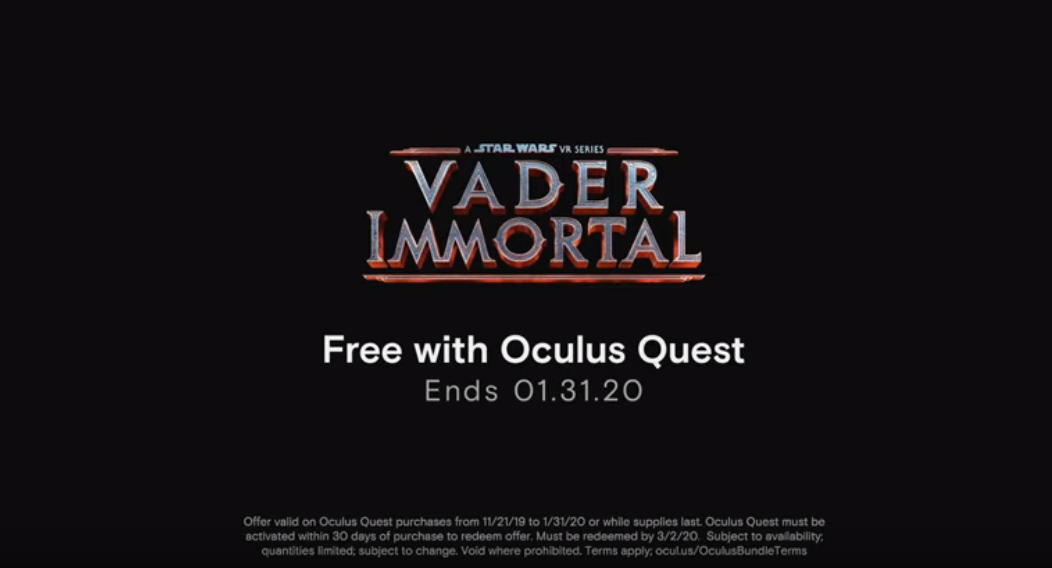 Facebook is offering a promotion through the end of January bundling together the Vader Immortal Star Wars “VR Series” with the purchase of the $400 Oculus Quest all-in-one VR headset.