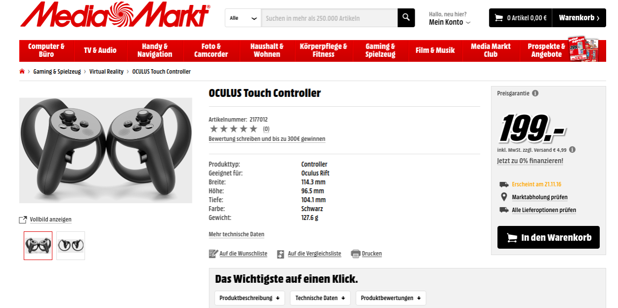 German retailer MediaMarkt has listed the anticipated position tracked controllers on its website. They’re available to pre-order for €199, which works out to be around $225 or £168. It’s apparently shipping on November 21st 2016. That date is in line with the Q4 2016 window that Oculus CEO Brendan Iribe previously provided. Normally we wouldn’t report on a simple listing like this that could easily be placeholder but MediaMarkt isn’t any old retailer; it’s one of Oculus VR’s official retailer partners for Europe, and will be one of the first to sell the Rift outside of Oculus itself later on this month.