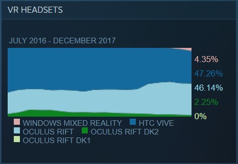 Funnily enough, the Windows headsets don’t even double the amount of Oculus Rift DK2 units still in use on Steam (2.25%). We’ll be interested to see how they grow in 2018.