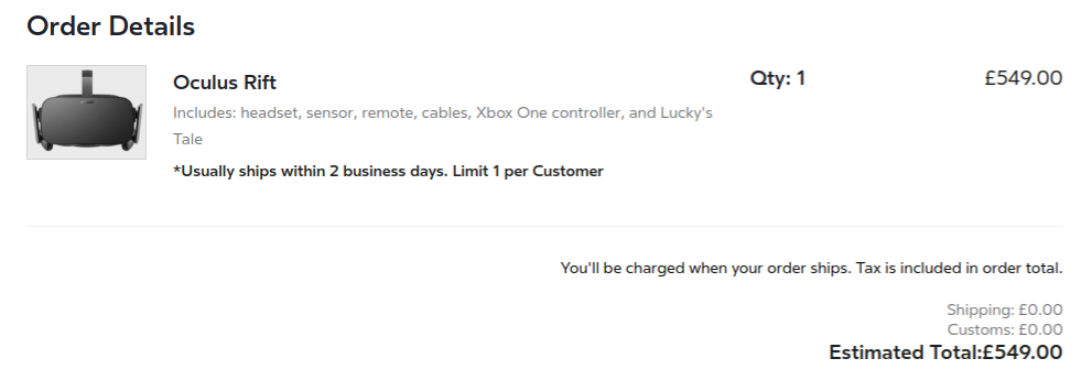 Oculus has quietly raised the price of the Rift by £50 in the UK at some point in the past week. When I wrote about the European retailer rollout for the device early last week, the device cost £499, with £30 shipping taking it to £529. Now the price of just the Rift itself is listed at £549 for UK orders. Oculus has a free shipping promotion going on for the rest of the month, but if the mailing price returns to £30 afterwards then it will cost £579 to get the Rift from the Oculus Store.