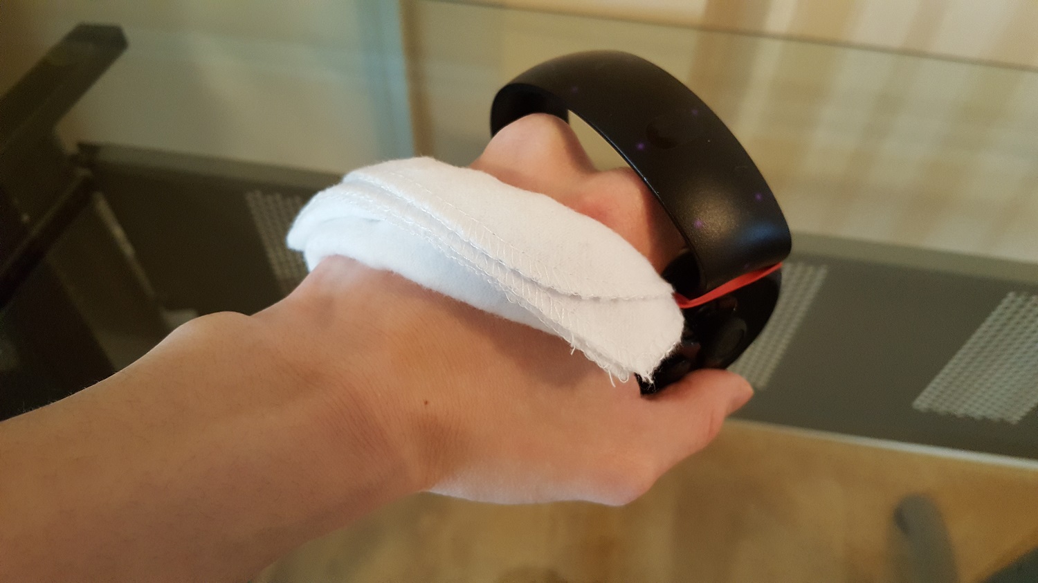 Step 6: Wear the controller. If it feels too loose, add more padding. If it feels too tight, use a longer rubber band. These ways of adjusting tightness for yourself enables you to preserve the high-friction positioning between the rubber band and tracking ring.