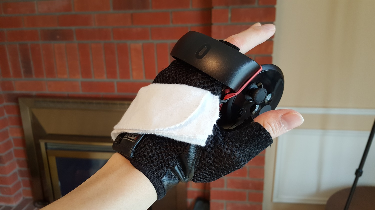 This one just adds in a glove and some sewing, so you do need more things, but it’s not too much, and the experience is greatly improved. What I did was get a fingerless glove that had a velcro strap, wear it, wear the modded controller, and then use my free hand to force the controller strap into a position such that I would be holding the controller in the correct way.