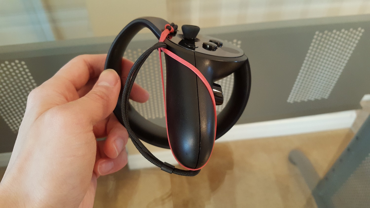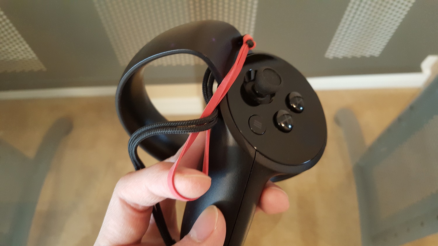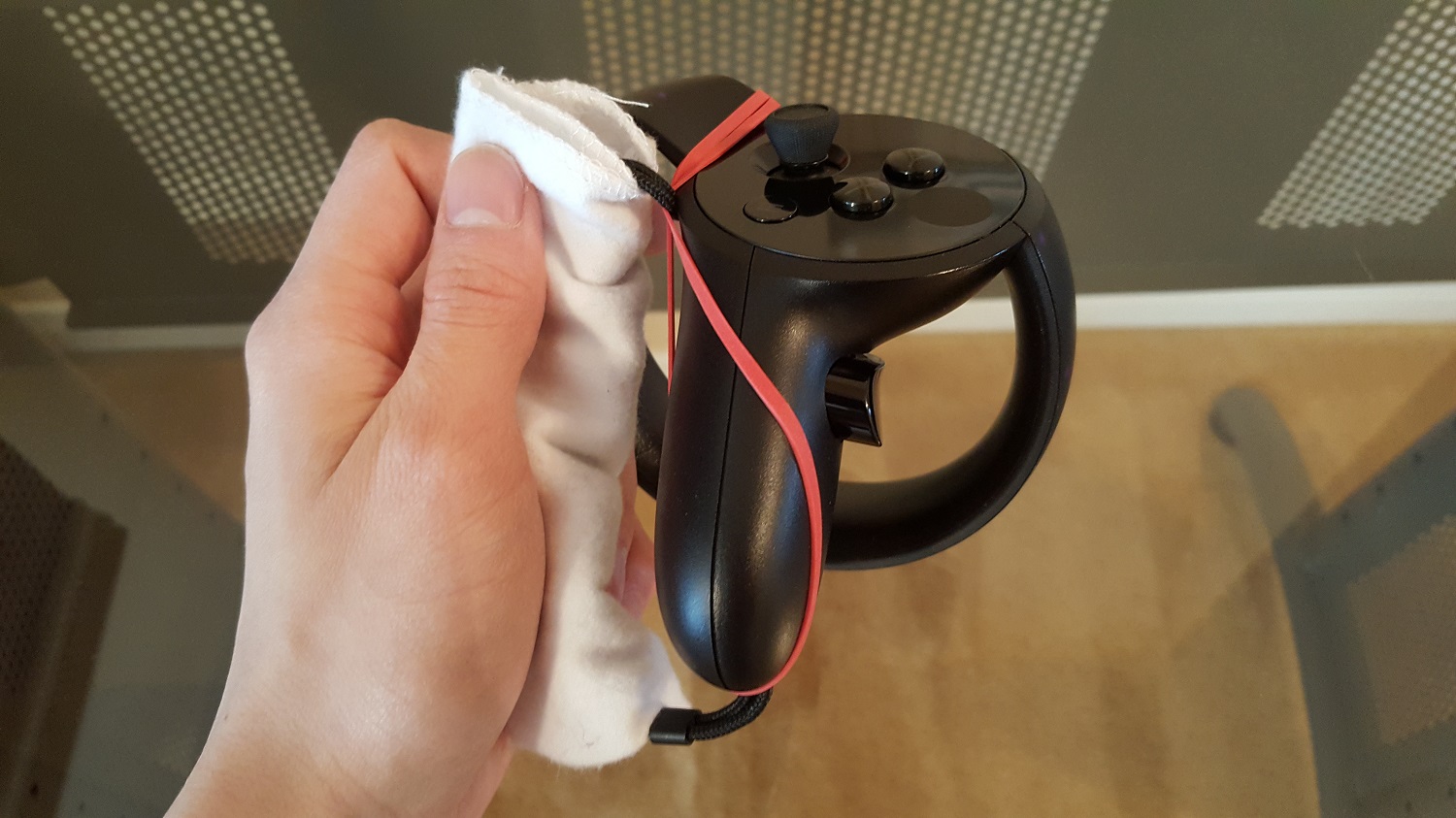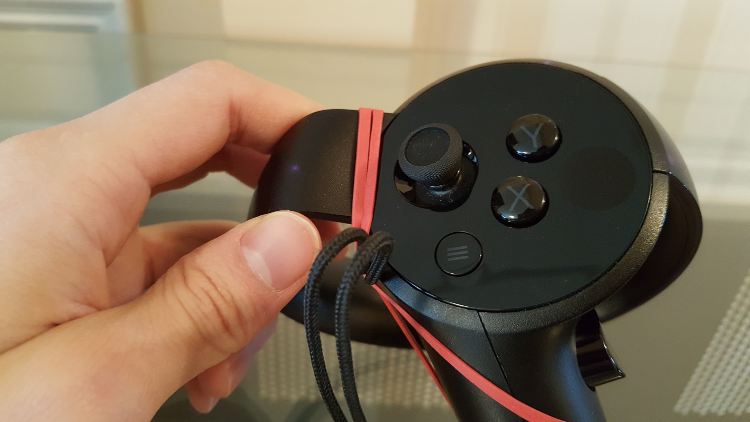 Step 1: Get an Oculus Touch controller and a rubber band that’s around 9 cm long, relatively “wide”, and high-friction. Then tie the rubber band to the controller wrist strap.