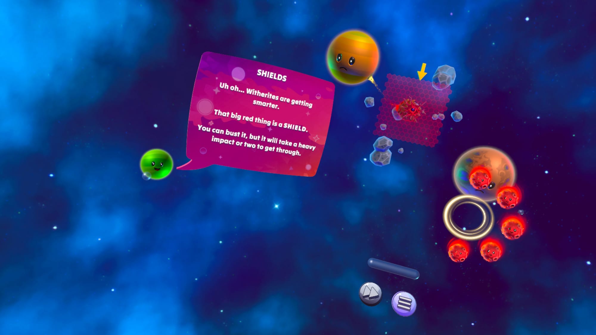 Oh My Galaxy! offers the sort of jump-in, jump-out game experience that I really enjoy these days. I’ve had a great time with my daughters, both around ten years old, launching in to clear a few levels and earn a few stars, inviting the cute personified celestial bodies into our home for a fifteen minute block of cosmic destruction before homework or dinner.