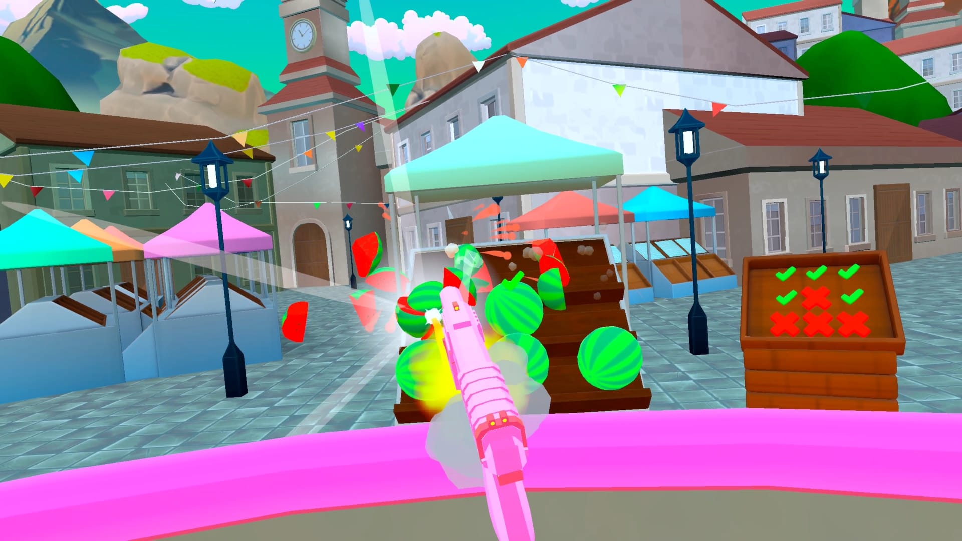 Inspired by other VR gun games like Robo Recall and Gun Club, Fehr and the team aimed to capture the satisfying feeling of shooting, ditching the violence in favor of vibrant cartoonish landscapes. “Imagine Warioware meets VR shooting,” Fehr advised. “You have to think, aim, and blast to compete with friends for a high score through heaps of classic arcade-inspired shooting minigames.”