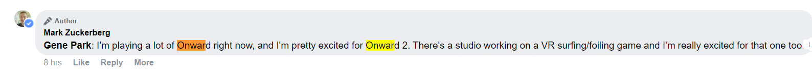 Responding to a question about which VR games he’s most looking forward to on a recent Facebook post, Zuckerberg said he was “pretty excited for Onward 2.” Here’s a screencap we took of the answer though, at the time of writing, it’s still there in the replies.